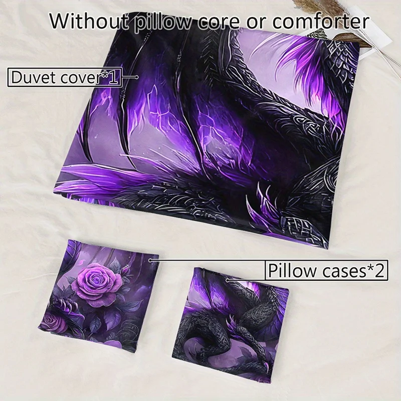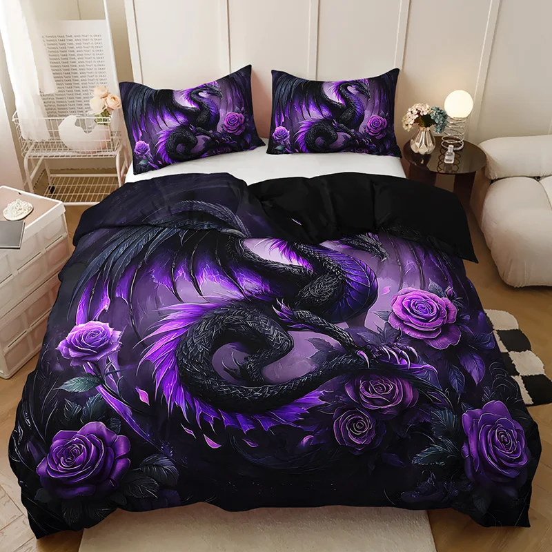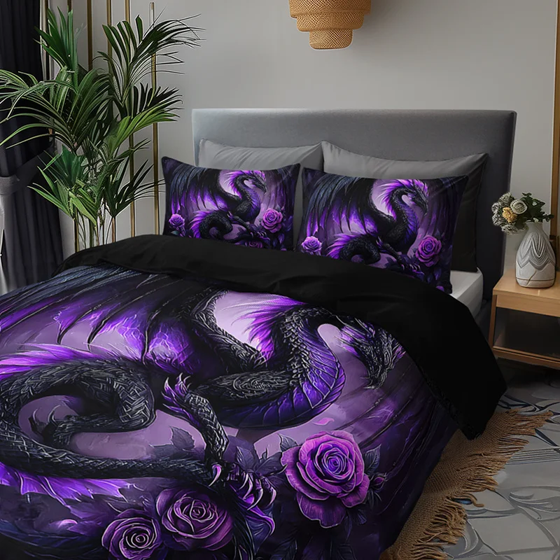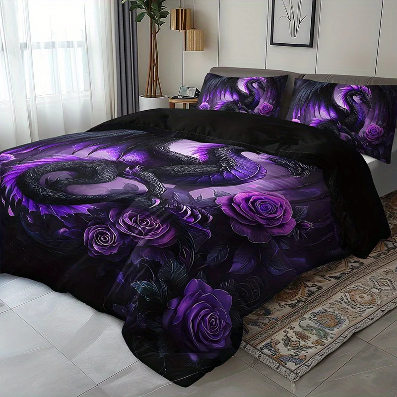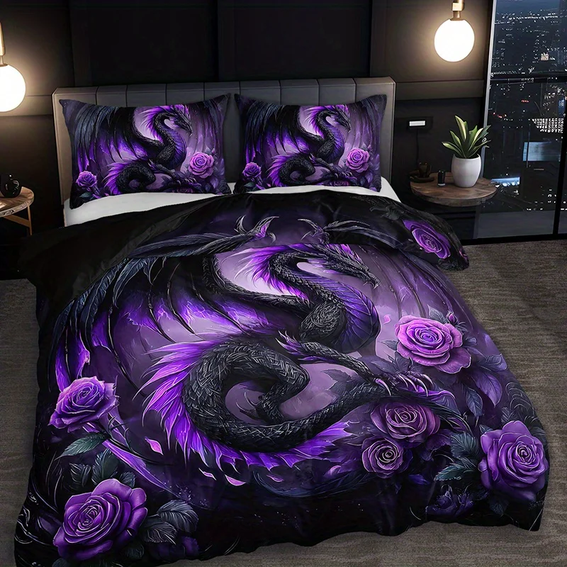 [Gothic Style Bedding] 2/3pcs Dark Purple Dragon and Rose Bedding Set, 1 Duvet Cover + 1/2 Pillowcases) Christmas Gift