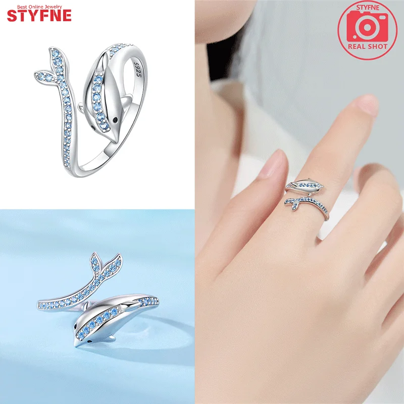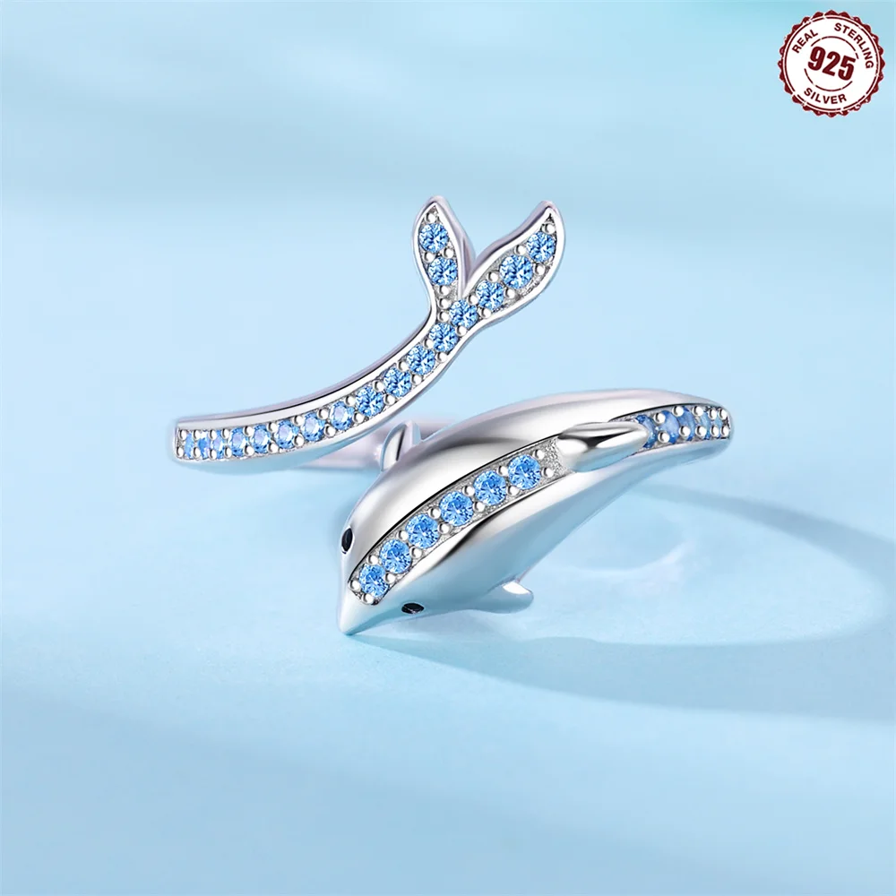 Real 925 Sterling Silver Blue dolphin CZ Finger Rings Adjustable Ring For Women Wedding Jewelry Gifts with GIFT BOX
